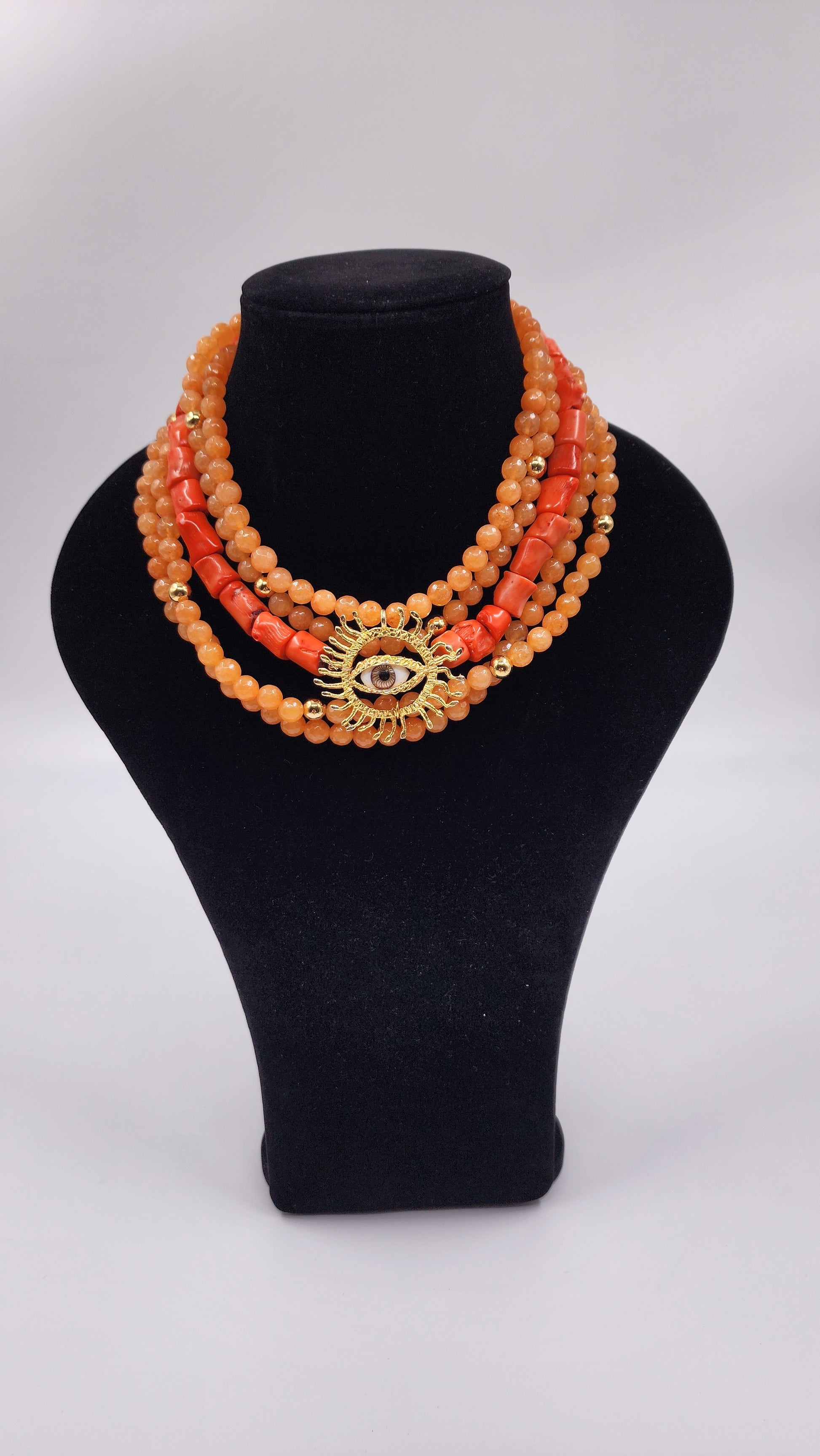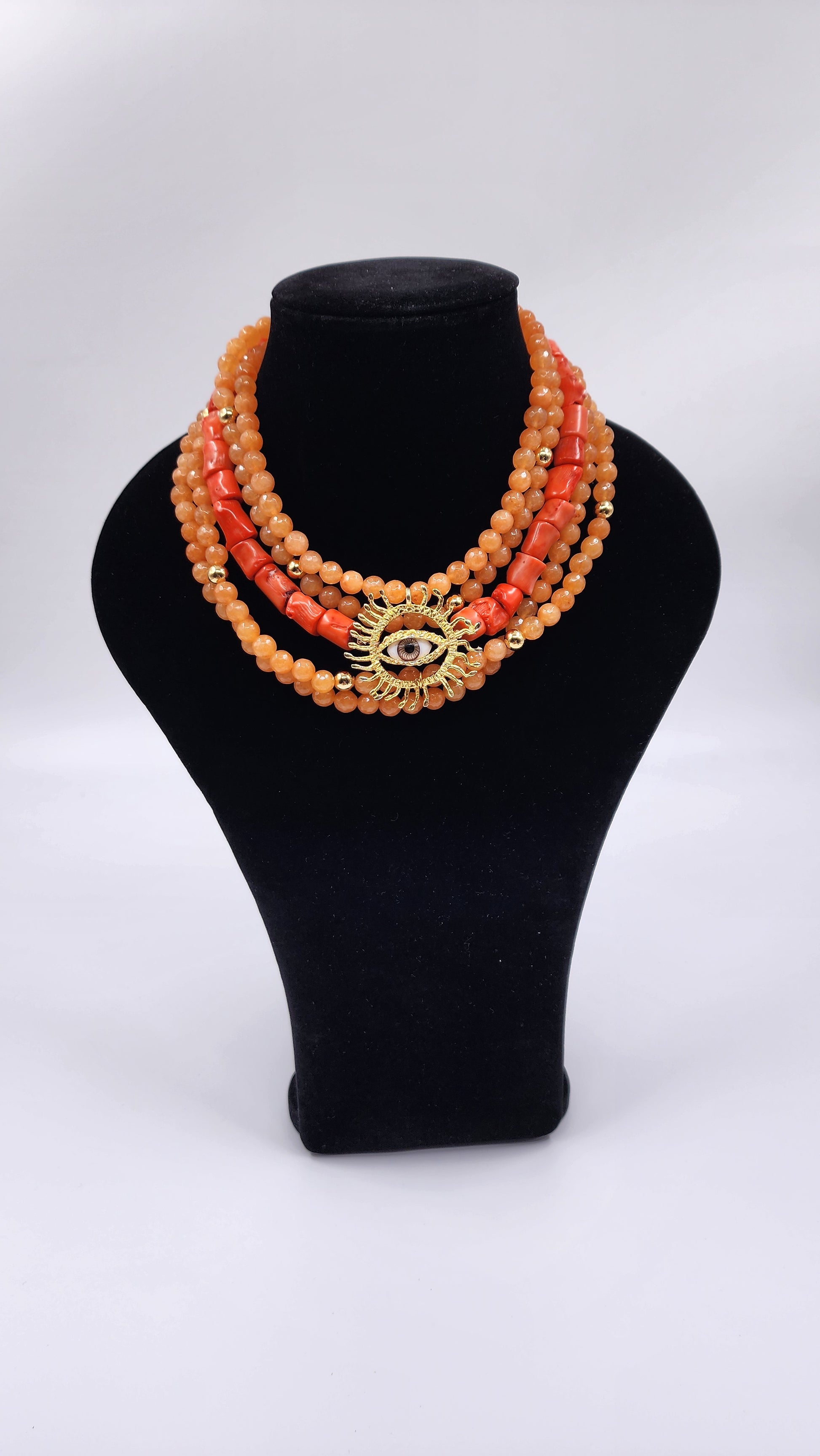 Collar coral con dije bordado de sol con ojo