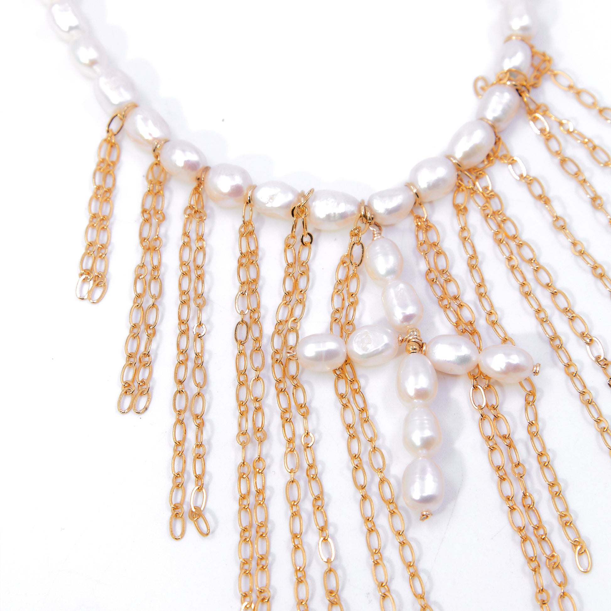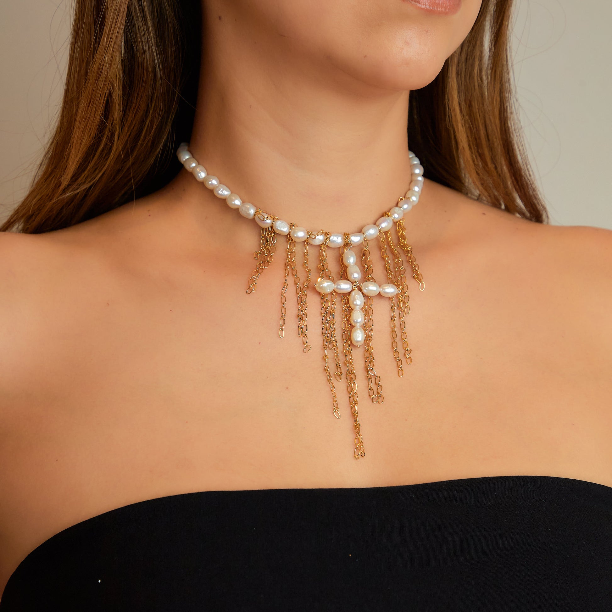 Collar de perla de río con cascada de cadena y dije hecho a mano de cruz con perla de río