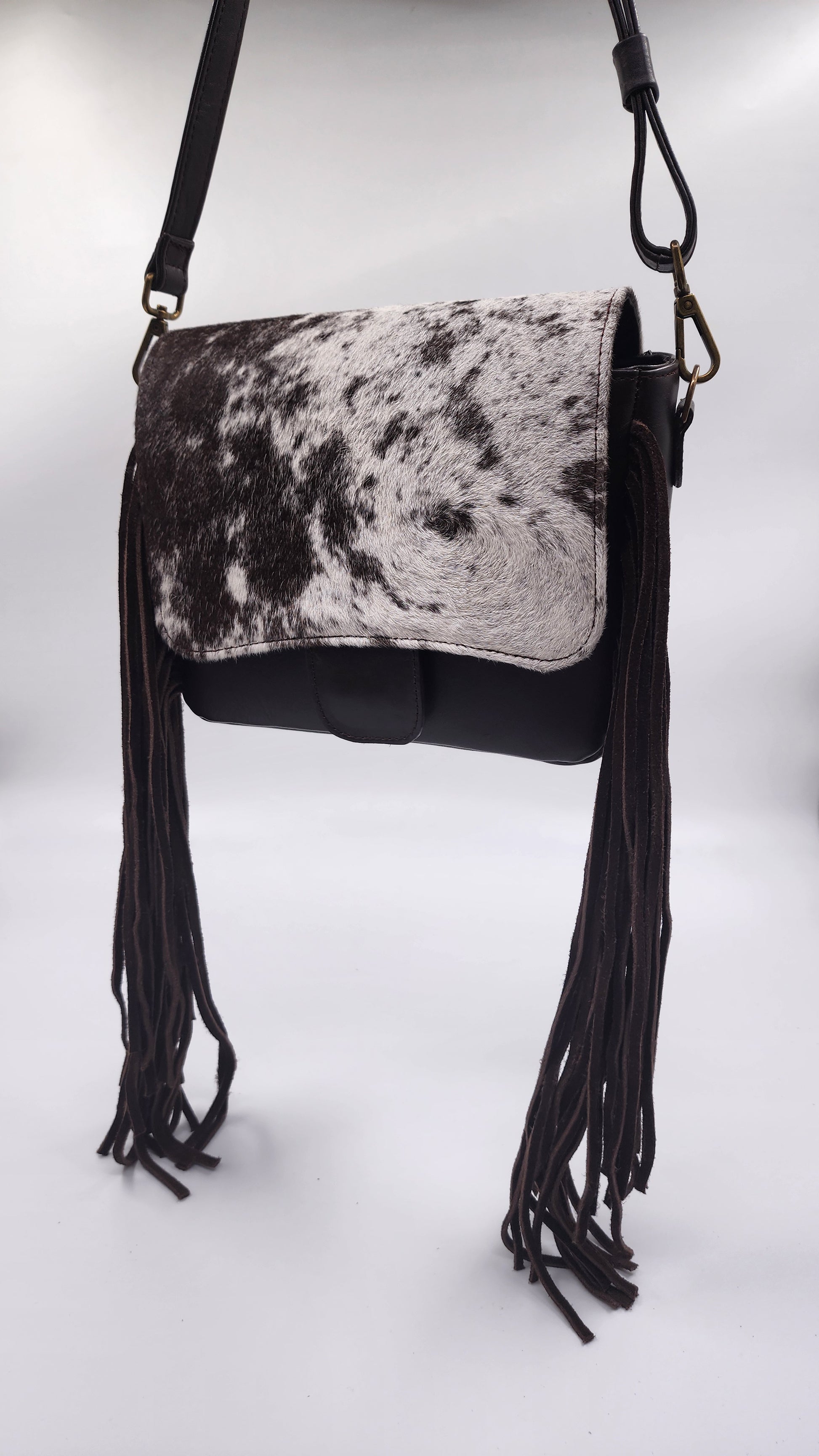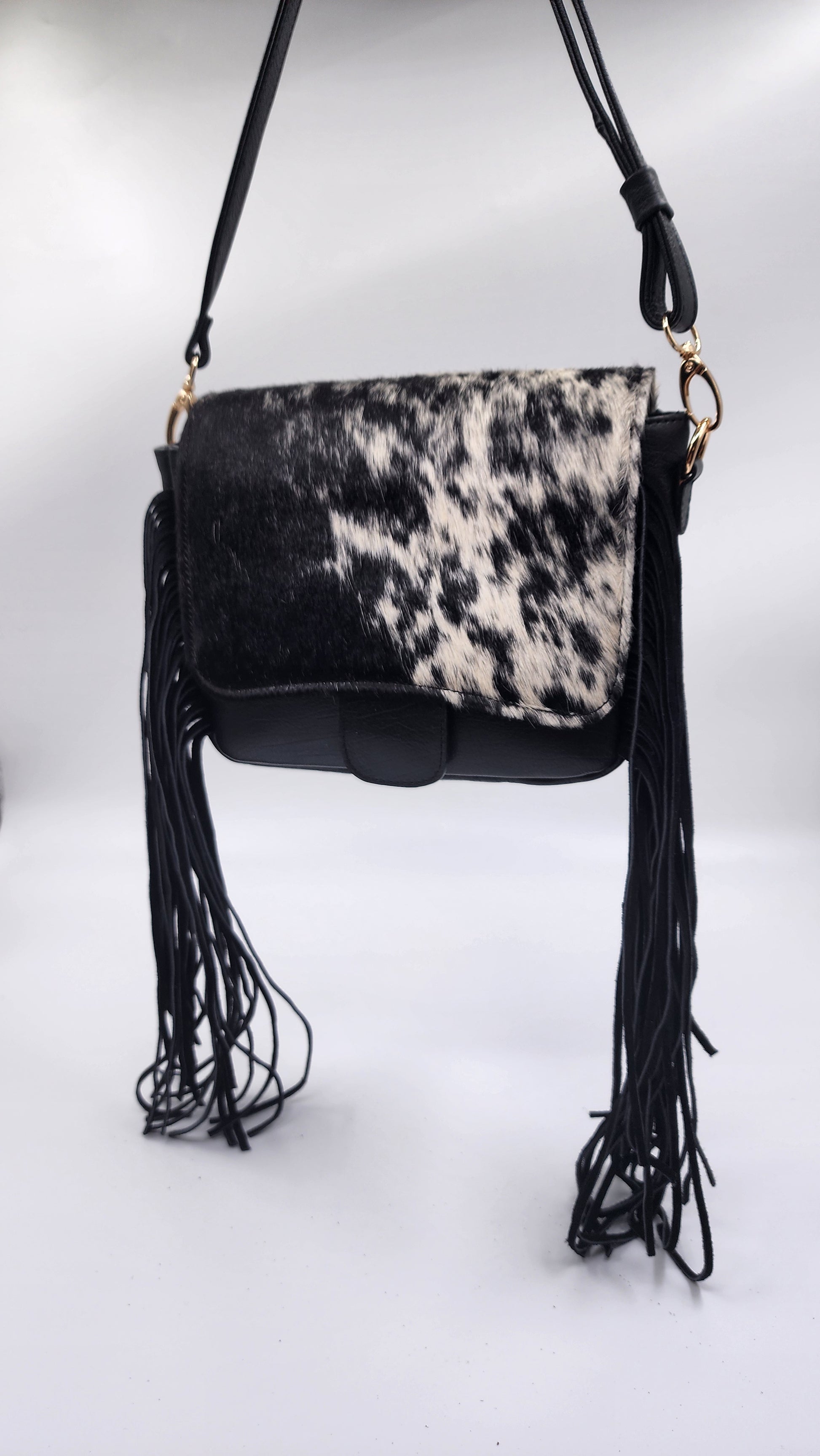 Este modelo se caracteriza por su diseño increíble de piel de ternera natural con pelo, y cuenta con detalles como flecos en piel, que aportan un toque de statement piece.