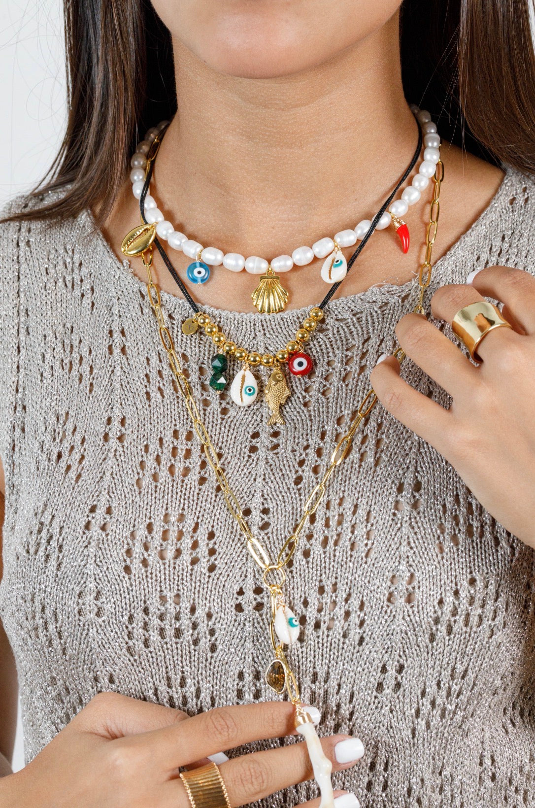 Layer(1): Perlas naturales con dijes de chapa de oro y ojos turcos